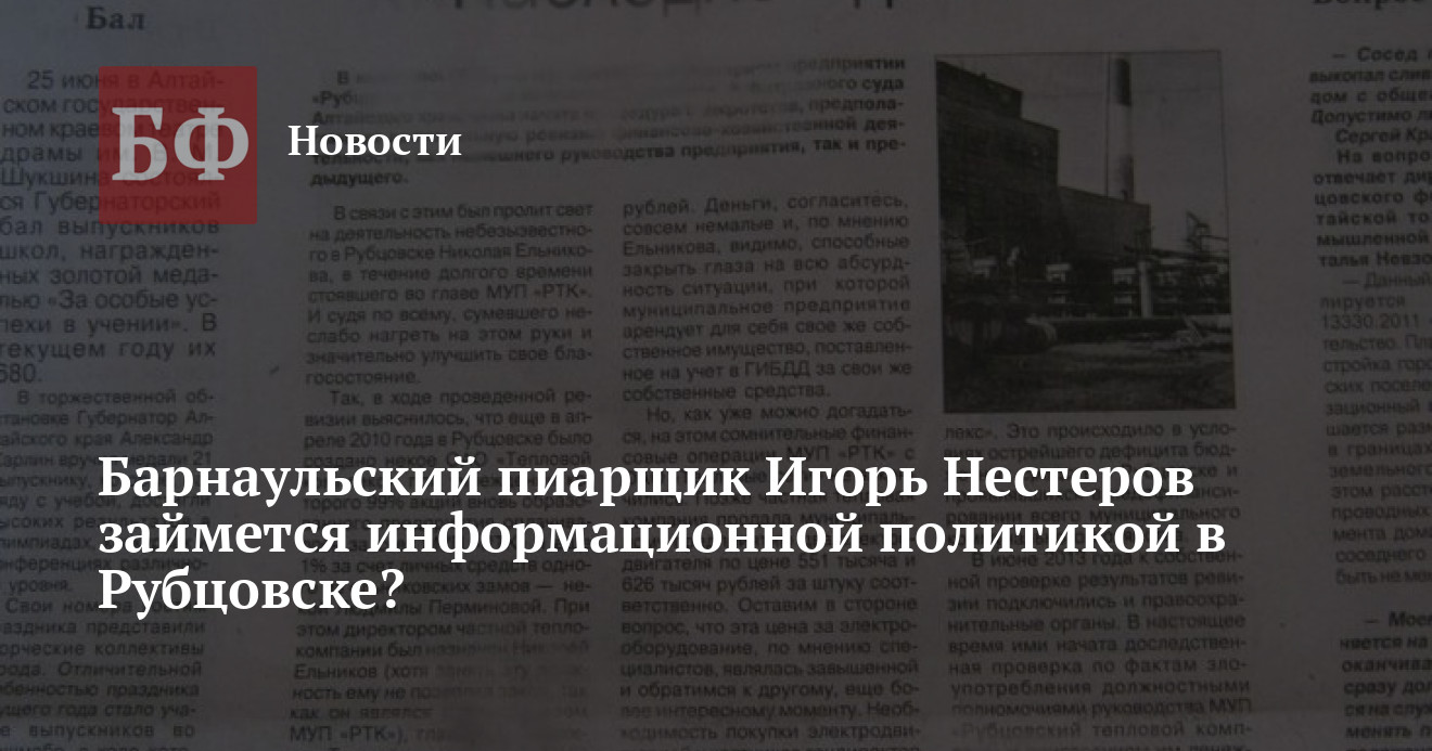По сообщению источников ИА «Банкфакс», в ближайшее время экс-руководитель комитета информационной политики администрации Барнаула Игорь Нестеров будет курировать аналогичное направление в команде сити-менеджера Рубцовска. После получившего резонанс в профессиональной среде увольнения из администрации Барнаула в январе 2011 года он отбыл в Архангельскую область, однако не так давно при невыясненных обстоятельствах вернулся в Алтайский край.