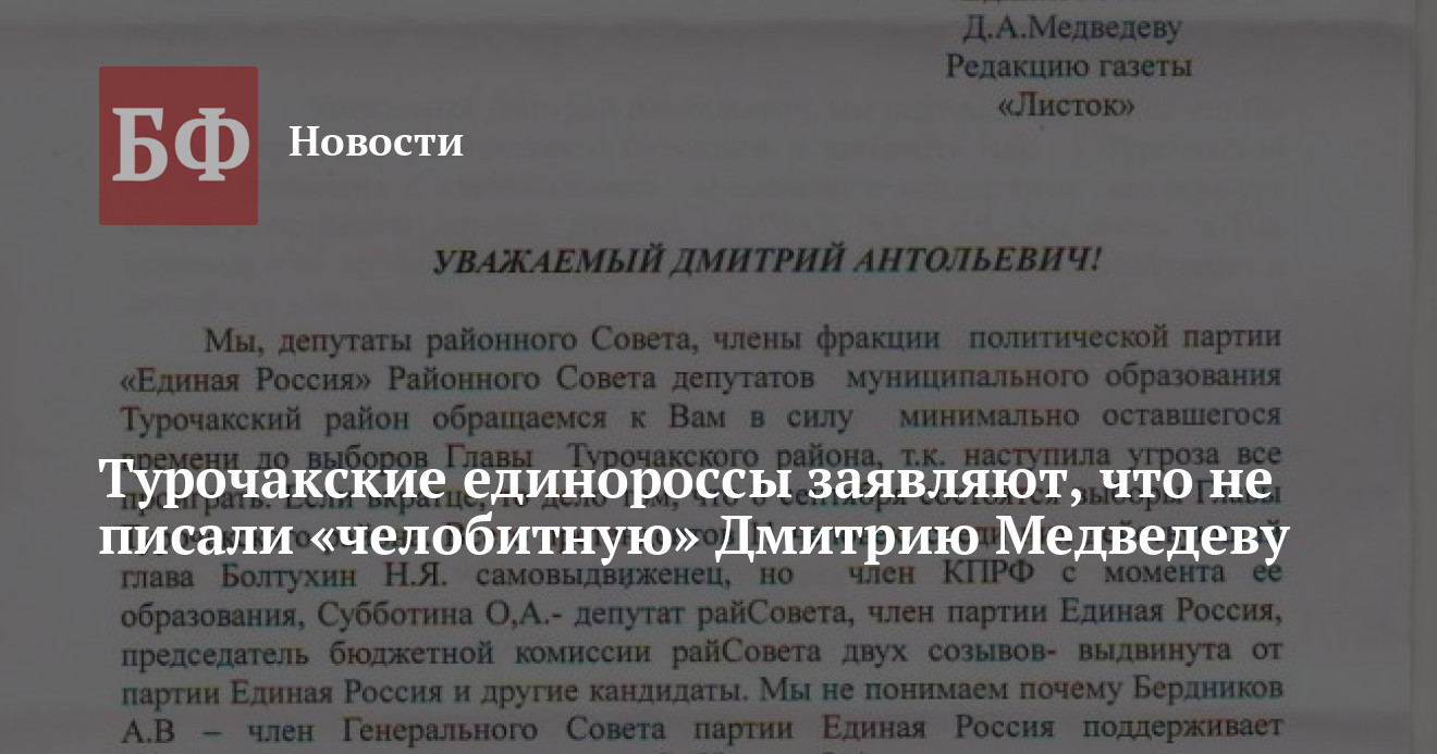 16 августа на сайте еженедельника «Листок» было опубликовано письмо депутатов-единороссов Турочакского района Республики Алтай к председателю «Единой России» Дмитрию Медведеву, в котором они откровенно изобличают своих коллег из местного отделения партии. Однако, как утверждают сами депутаты, никакого письма партийному руководству они не отправляли и не подписывали.