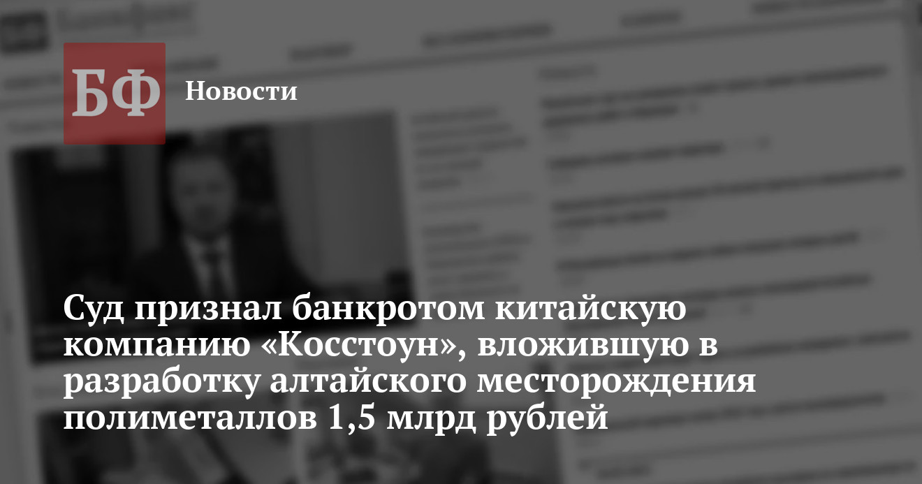 Несмотря на инвестиции в размере около 1,5 млрд рублей, китайским инвесторам так и не удалось наладить разработку Захаровского месторождения полиметаллов на Алтае. Созданная для реализации этого проекта компания «Косстоун» утратила лицензию еще в прошлом году, а теперь и сама признана банкротом, сообщает издание «КоммерсантЪ».