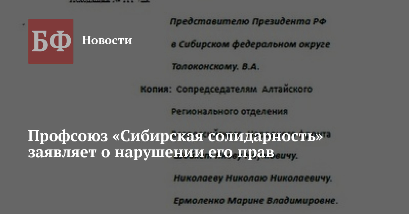 Председатель межрегионального межотраслевого профсоюза «Сибирская солидарность» имени Столыпина Андрей Маевич направил обращение полпреду президента РФ в СФО Виктору Толоконскому, а также сопредседателям алтайского отделения всероссийского «Народного фронта» Якову Шойхету, Николаю Николаеву и Марине Ермоленко. В своем письме он заявляет о нарушении прав их организации и просит оказать содействие.