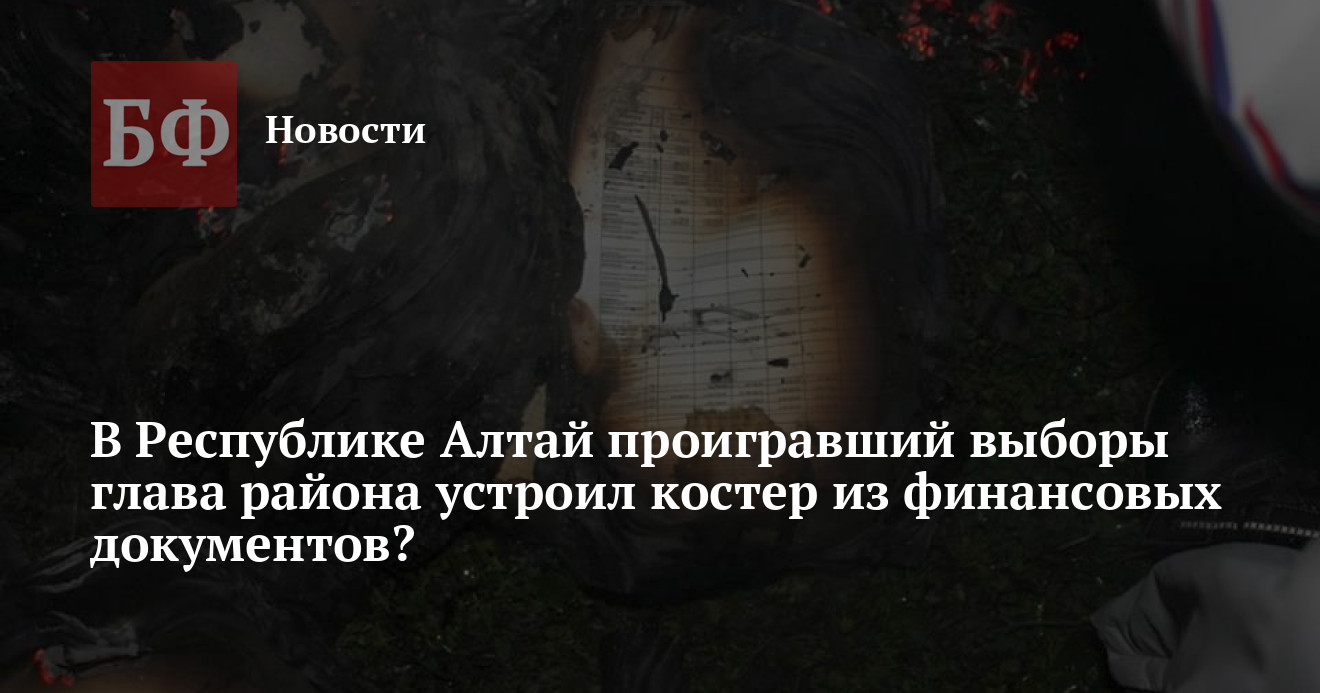 После проигрыша на выборах 8 сентября бывший глава Турочакского района Николай Болтухин устроил во дворе районной администрации костер из финансовых и административных документов. Об этом сообщил в Facebook руководитель некоммерческой организации Фонд «Открытый Алтай» Сергей Андреев.