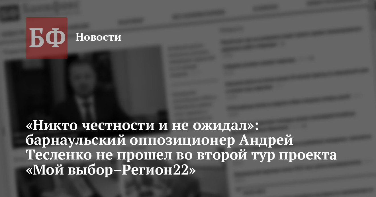 На днях стартовал второй этап конкурса реготделения партии «Единая Россия» «Мой выбор—Регион22». По результатам первого тура голосования из гонки выбыло около 450 участников, среди них — барнаульский оппозиционер Андрей Тесленко, участие которого в проекте вызвало особый интерес.