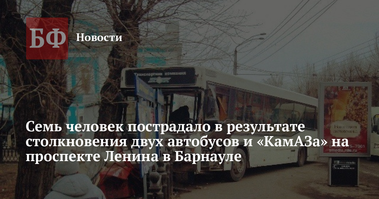 Утром 12 ноября на пересечении проспекта Ленина и улицы Гоголя в Барнауле столкнулись два пассажирских автобуса, следовавших по маршрутам № 10 и № 35, а также автомобиль «КамАЗ», сообщает отдел пропаганды ГИБДД УМВД по Барнаулу.