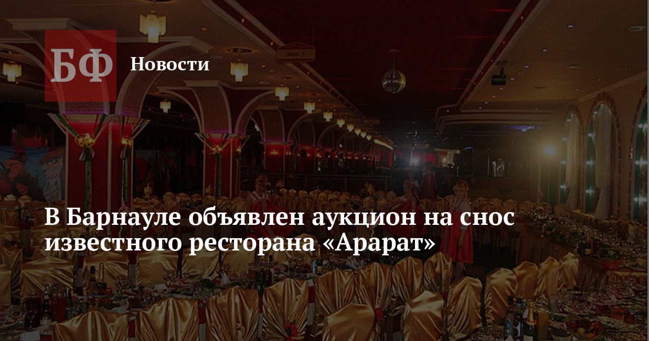 До 30 декабря текущего года должно быть снесено здание ресторана «Арарат» (Змеиногорский тракт, 118, в). Такие сроки установлены в документации к аукциону на выполнение соответствующих работ. Заказчиком сноса выступает администрация Центрального района Барнаула. Аукцион намечен на 6 декабря.