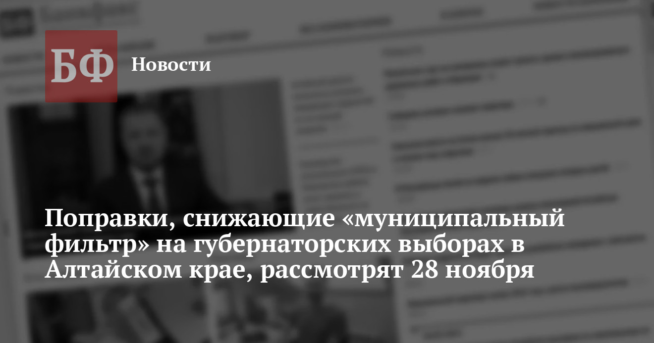 В повестку очередной сессии Алтайского краевого Заксобрания, которая состоится 28 ноября, включен вопрос о внесении изменений в региональное законодательство, предполагающих снижение так называемого муниципального фильтра на выборах губернатора края. Об этом сообщает официальный сайт АКЗС.