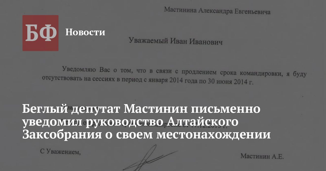 Находящийся в международном розыске парламентарий сообщает, что не сможет присутствовать на сессиях АКЗС с января по июнь 2014 года из-за длительной командировки. К письму прилагается приказ, из которого следует, что он командировал себя в Эвенкийский автономный округ «в связи с необходимостью привлечения новых членов в правозащитную организацию» — Алтайский краевой общественный комитет по защите прав и свобод граждан (Мастинин является председателем правления данной структуры — прим. ред. «БФ»).