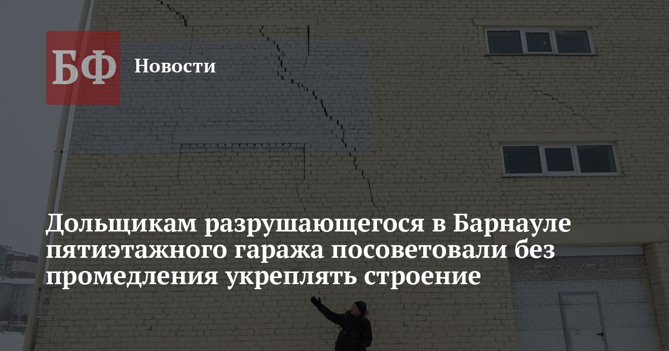 Дольщики аварийного гаража на Северо-Власихинском проезде, 49, построенного ООО «Стройтрест», чье руководство обвиняется в мошенничестве, не смогли получить заключение об его аварийном состоянии. 29 января сотрудники Алтайской лаборатории строительно-технической экспертизы после визуального осмотра здания заявили, что стоимость полного обследования, которое необходимо, чтобы подтвердить непригодность здания к эксплуатации и установить причины, равна 500 тысячам рублей.