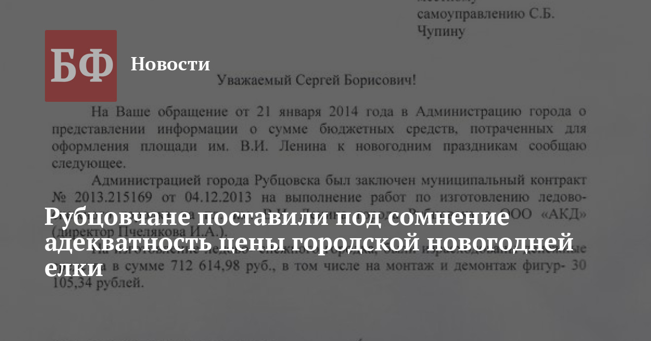 В ответ администрация города сообщила, что приобретение и установка елки, ее украшение, размещение светящихся и снежных фигур, установка горки и т.д. обошлись муниципалитету в более чем 700 тысяч рублей. В качестве подрядчика выступало ООО «Алтайский купеческий дом» (АКД). Любопытно, что директором данного предприятия является Инесса Пчелякова, по информации инсайдеров, связанная родственными отношениями с «серым кардиналом» рубцовской политики — заместителем главы Рубцовска Сергеем Пчеляковым.