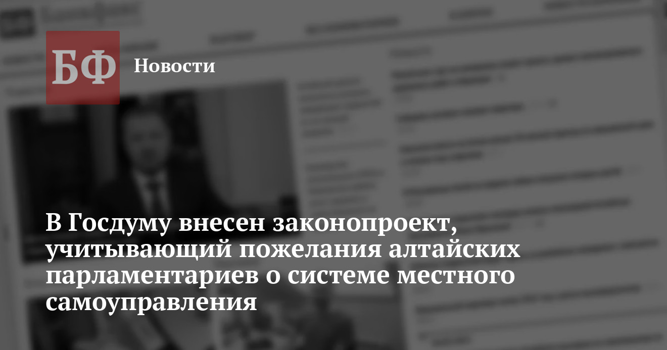 12 марта в Госдуму был внесен законопроект, существенно изменяющий ряд положений закона «Об общих принципах организации местного самоуправления в РФ». Как сообщает офсайт реготделения «Единой России» в Алтайском крае, документ учитывает ряд предложений алтайских депутатов.