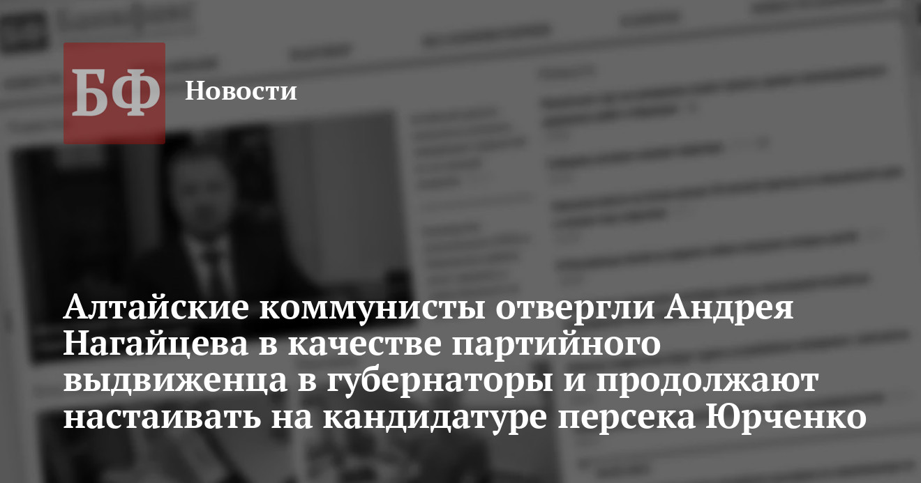 Кроме того, г-жа Данилова проинформировала участников пленума о результатах рассмотрения кандидатуры на пост губернатора региона, предложенной избирательным штабом ЦК КПРФ. Им оказался бывший оппозиционер Андрей Нагайцев, в 2010 году баллотировавшийся на пост мэра Бийска, а в 2013 году непродолжительное время работавший в должности вице-мэра наукограда. Обсудив партийные и деловые качества Нагайцева, члены бюро приняли решение отклонить данную кандидатуру, заявила Данилова.