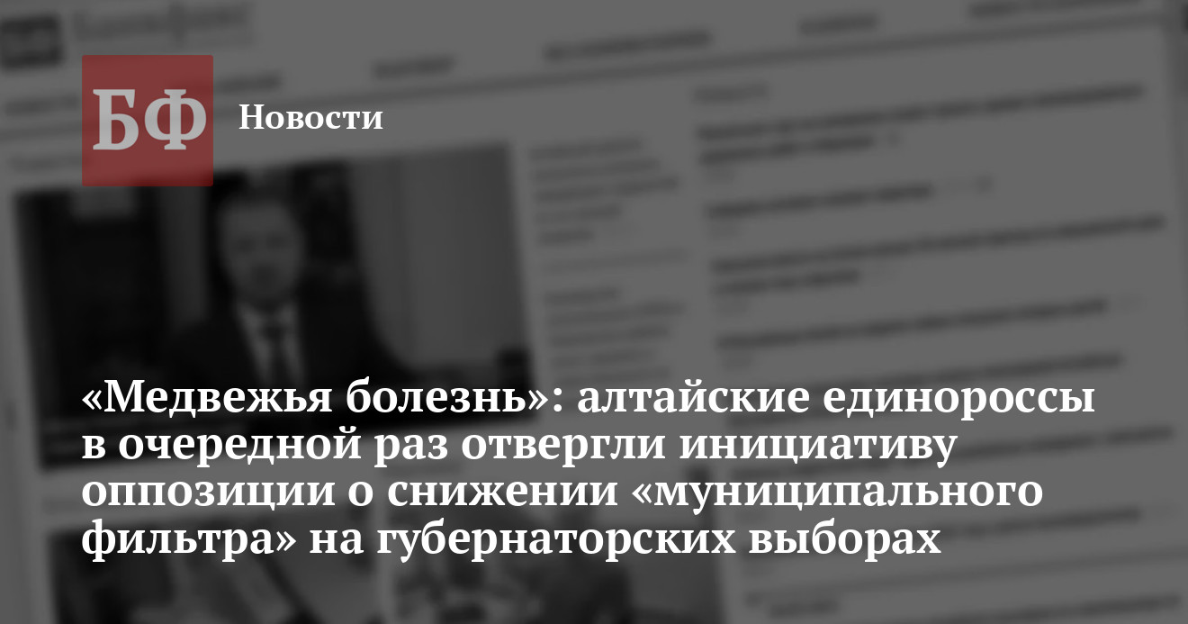 30 апреля на сессии Алтайского Заксобрания депутаты рассмотрели внесенную тремя фракциями поправку в региональное законодательство о выборах, которая предусматривает снижение «муниципального фильтра» на губернаторских выборах с 7 до 5%. Жесткая позиция контролирующей большинство депутатских мандатов «Единой России» не позволила оппозиционным фракциям облегчить себе задачу по сбору подписей муниципальных депутатов в поддержку своих кандидатов в губернаторы.