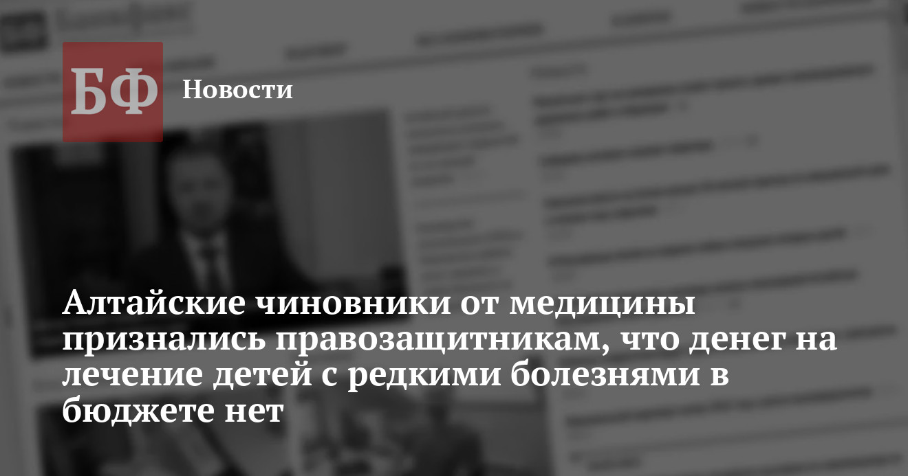 Руководство Алтайкрайздрава призналось, что в краевом бюджете нет денег на лечение тяжело больных детей и попросило оказать благотворительную помощь. Об этом сказано на сайте детского правозащитного проекта «Правонападение», входящего в структуру благотворительной организации «Русфонд».