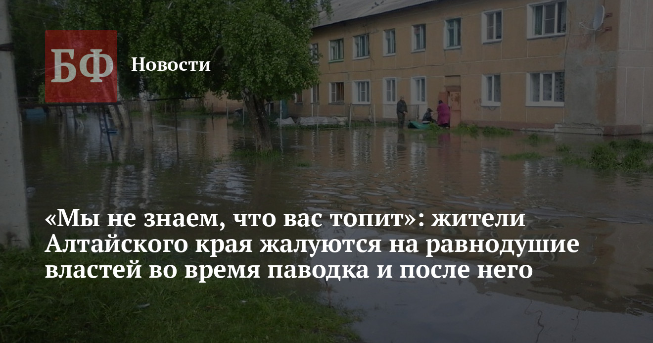 Свои жалобы через социальные сети люди пытаются довести до федеральных, региональных и местных властей. Жительница села Малоугренево Бийского района Елена Максименко утверждает, что с самого начала людям приходилось рассчитывать только на себя. «Не было никакого оповещения о надвигающемся наводнении. Ночью 30 мая мне позвонили знакомые и сказали, что в районе Бийска прорвало дамбу. Я, в свою очередь, начала обзванивать соседей и предупреждать их. До утра мы сидели на крыше, и все это время пытались дозвониться в МЧС с просьбами об эвакуации, но нам отвечали: „У нас нет информации, что Малоугренево топит, обращайтесь к местным властям“. Лишь к утру местные жители заправили трактор и сняли нас с крыши», — вспоминает Елена Максименко.