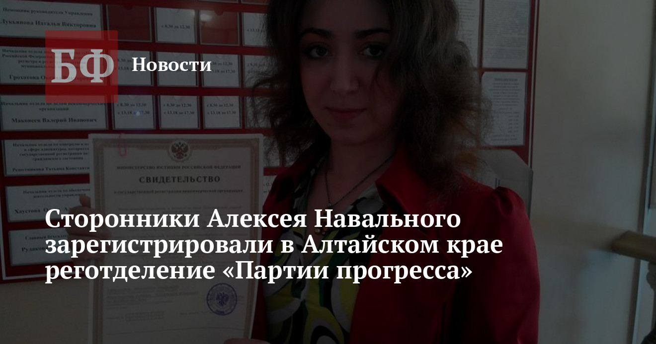 Министерство юстиции все же зарегистрировало региональное отделение «Партии прогресса» сторонников известного блогера и оппозиционера Алексея Навального. Об этом на своей странице в Facebook 11 июня сообщила председатель алтайского реготделения Ольга Фотиева.