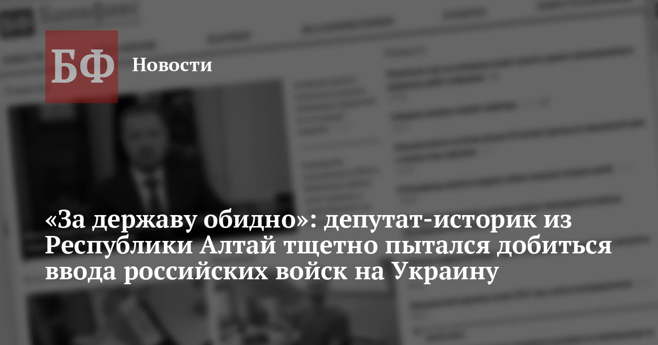 Письмо заканчивается пафосным обращением к президенту: «Мы победим, потому что на нашей стороне Правда! Мы с вами, Владимир Владимирович, действуйте! Донбасс ждет нашей помощи!» Однако после озвученного на федеральном уровне заявления об отказе ввода войск алтайский депутат посетовал, что Россия упустила шанс добиться, чтобы «нас зауважали».