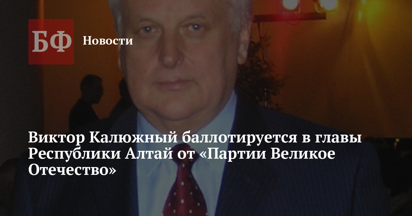 Бывший глава Министерства топлива и энергетики РФ и экс-посол России в Латвии Виктор Калюжный стал кандидатом на пост главы Республики Алтай от «Партии Великое Отечество», которую возглавляет одиозный политик Николай Стариков. Об этом ИА «Банкфакс» сообщили в республиканском избиркоме.