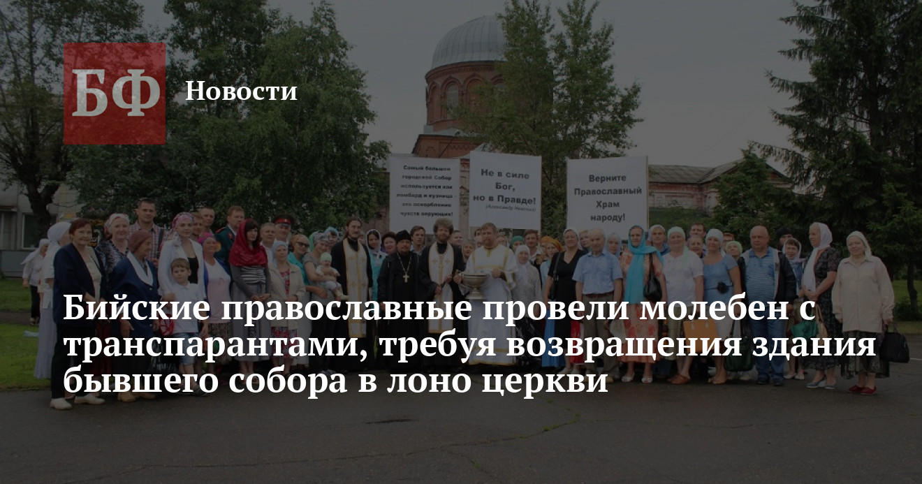 Православные Бийска провели молебен о возвращении одного из самых больших соборов за Уралом и самого крупного в Барнаульской епархии — собора Александра Невского — в лоно церкви. В настоящий момент здание принадлежит частным лицам, в нем размещены ломбард и другие учреждения, сказано на сайте Барнаульской епархии РПЦ.