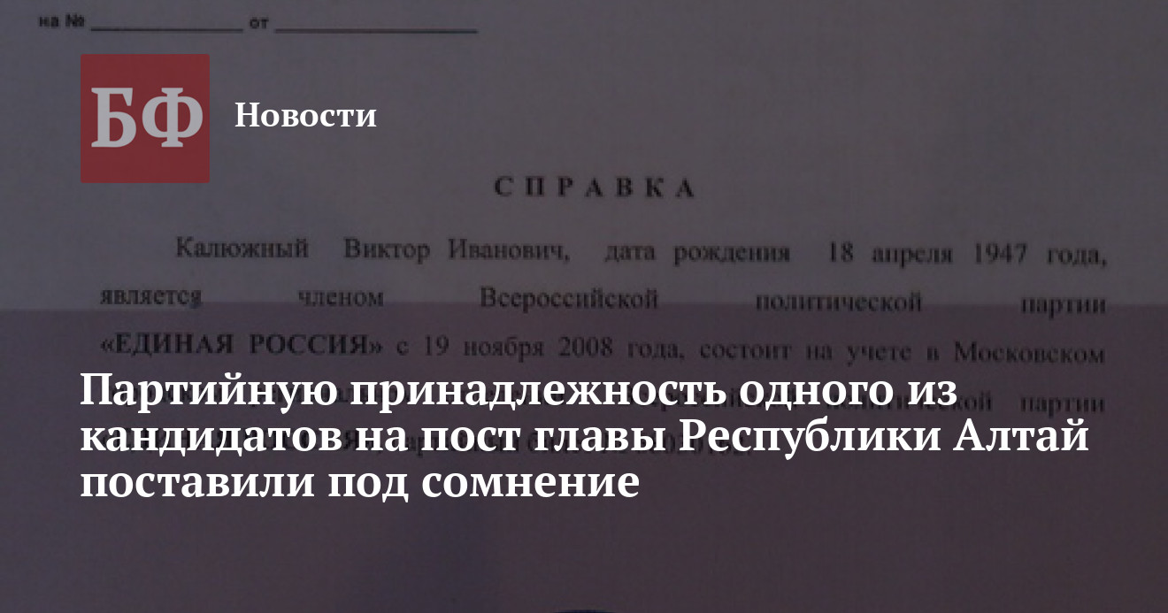 Между тем на республиканских сайтах появилась копия справки за подписью секретаря Московского отделения «ЕР» Николая Гончара, удостоверяющая, что, по данным на 4 июля, Виктор Калюжный все еще является членом «партии власти». Источники и происхождение этой справки неизвестны. Вместе с тем 6 июля оппозиционный действующей управленческой команде региона сайт «Хан-Алтай» сообщил, что 16 июня перед выдвижением на пост главы РА Калюжный решил подать заявление о выходе из партии «Единая Россия».