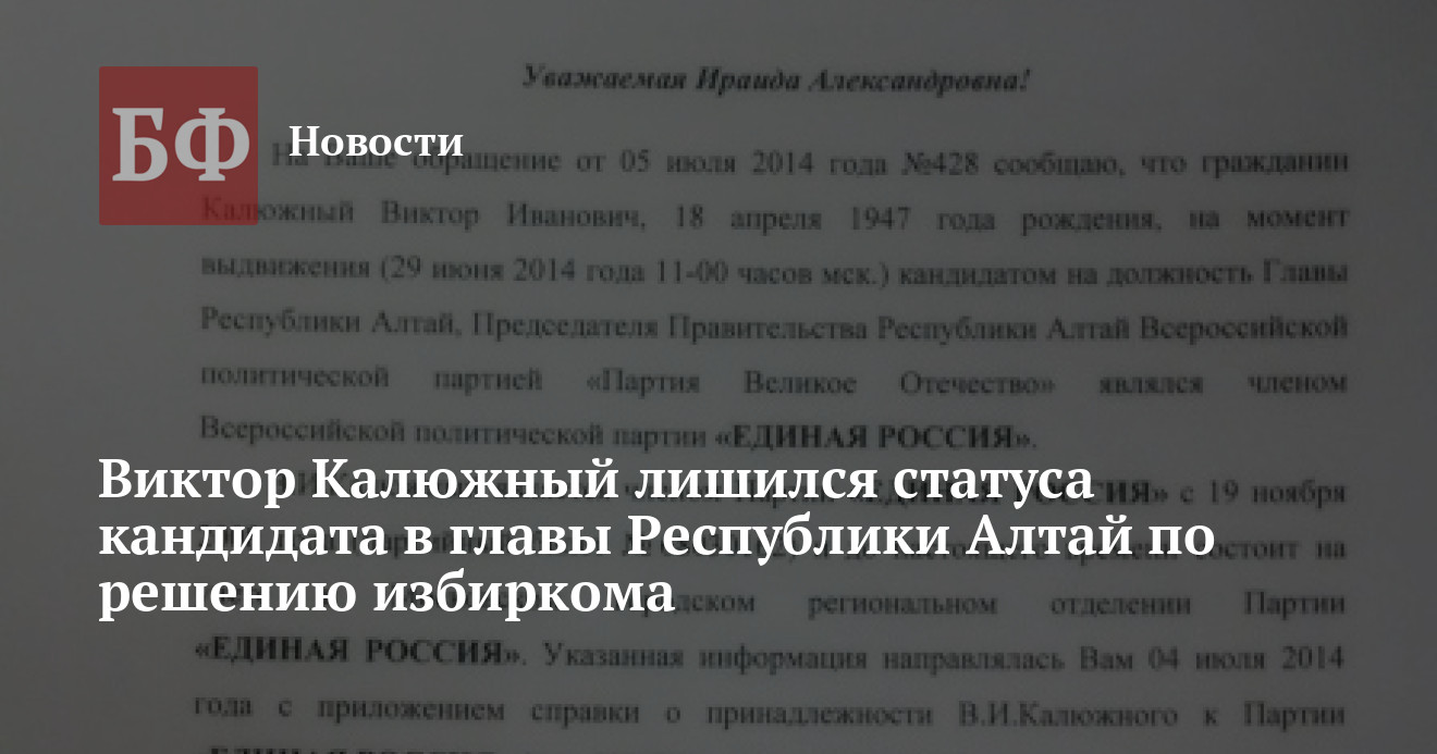 Между тем на республиканских сайтах появилась копия справки за подписью секретаря Московского отделения «ЕР» Николая Гончара, удостоверяющая, что, по данным на 4 июля, Виктор Калюжный все еще является членом «партии власти». Источники и происхождение этой справки неизвестны. Вместе с тем 6 июля оппозиционный действующей управленческой команде региона сайт «Хан-Алтай» сообщил, что 16 июня перед выдвижением на пост главы РА Калюжный решил подать заявление о выходе из партии «Единая Россия».