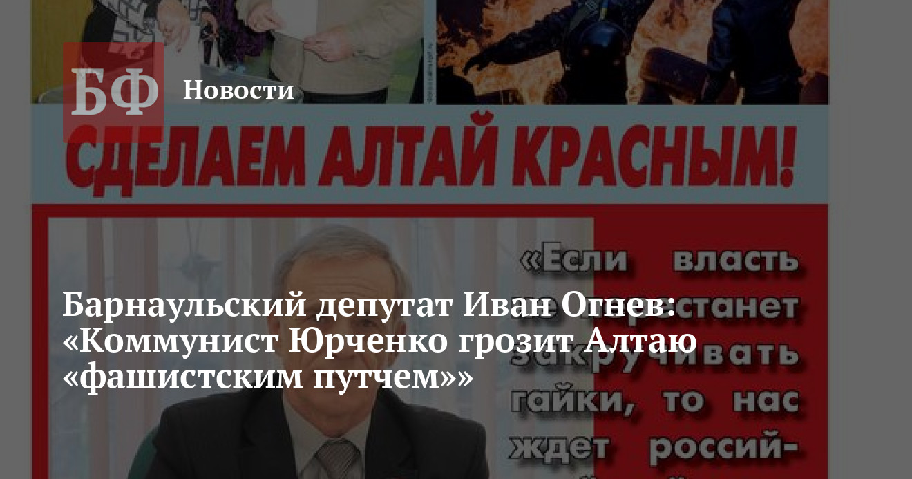 В редакцию ИА «Банкфакс» поступило заявление депутата Барнаульской городской Думы, единоросса Ивана Огнева, решившего дать оценку действиям кандидата в губернаторы Алтайского края от КПРФ, персека крайкома КПРФ Сергея Юрченко.