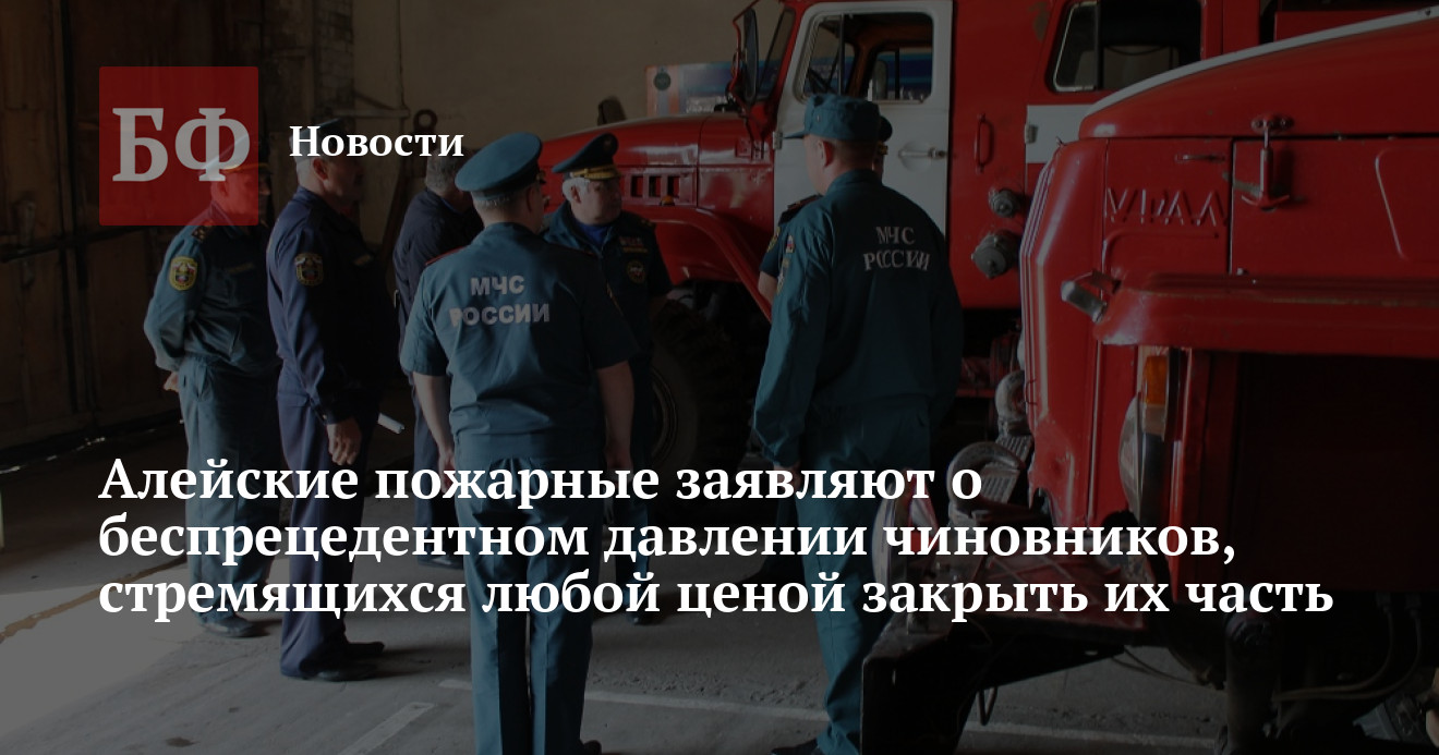 По его словам, в часть приехали руководитель Сибирского регионального центра МЧС России генерал-лейтенант внутренней службы Владимир Светельский, заместитель губернатора Алтайского края Яков Ишутин, руководство Алейска и городской пожарной охраны. Во время встречи с пожарными официальные лица не скупились на прямые обвинения и прямо заявили, что пожарную часть, споры вокруг закрытия которой продолжаются уже несколько месяцев, решено ликвидировать, несмотря на протесты работников и возможные нарушения законодательства. «В настоящее время наша часть опечатана, внутрь никого не пускают. Работников увольняют по одному, а на их место никого не берут. На встрече руководство прямо сказало, что сохранять часть нецелесообразно и якобы мы сами ее развалили, потому что не хотим работать. По нашему мнению, это не соответствует истине», — рассказал источник.