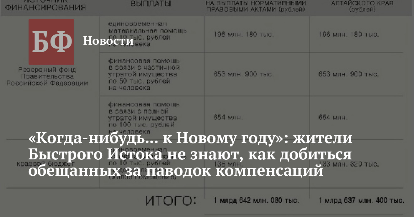 В редакцию ИА «Банкфакс» обратилась жительница села Быстрый Исток Ксения Яковлева. По ее словам, большинство жителей райцентра, который серьезно пострадал во время паводка двухмесячной давности, до сих пор не получили компенсации, положенные в связи с полной утратой имущества (по 100 тысяч рублей).
