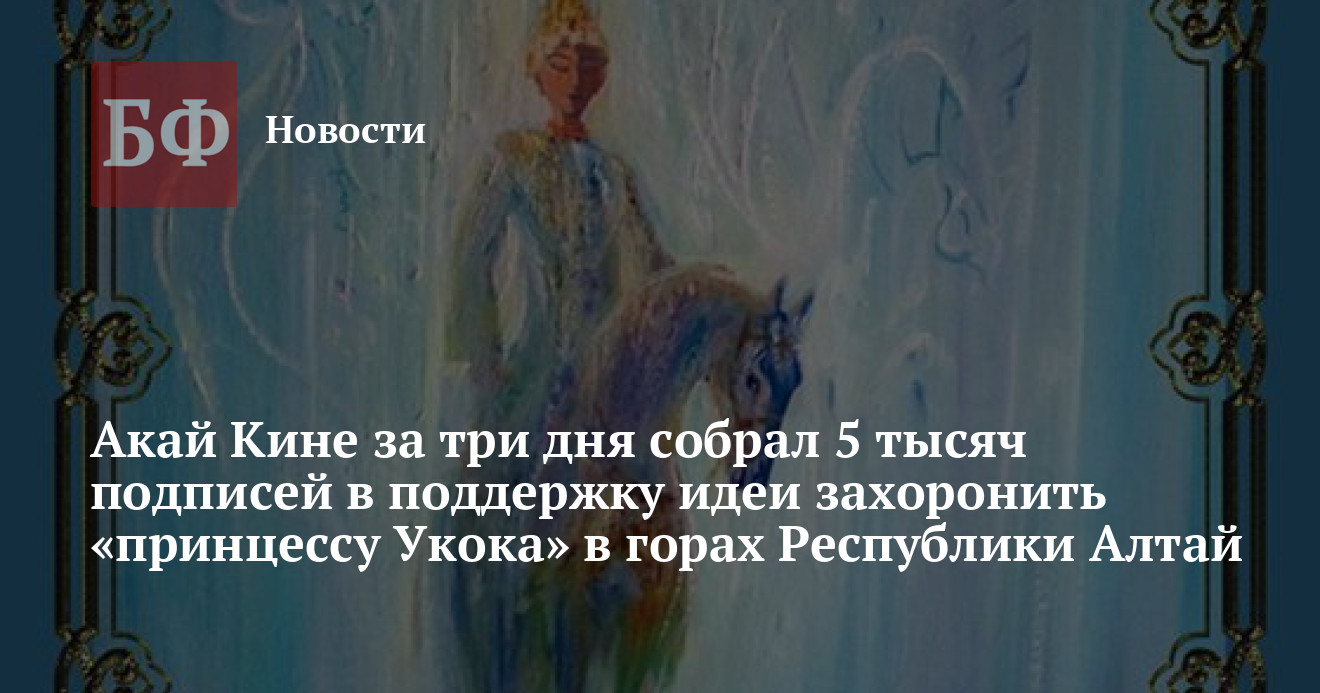 Активист национального движения этнических алтайцев Акай Кине (Сергей Кыныев) начал сбор подписей за захоронение мумии «принцессы Укока», которая, по его мнению, явилась причиной природных катаклизмов, обрушившихся на Республику Алтай в этом году. На 5 августа подписи в поддержку инициативы оставили более 5 тысяч жителей республики, сообщил Акай Кине ИА «Банкфакс».