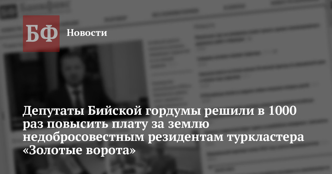 Для двух инвесторов автотуркластера «Золотые ворота» плата за землю будет поднята в 1000 раз. Такое решение принято на заседании Бийской гордумы 21 августа, рассказал корреспонденту ИА «Банкфакс» руководитель управляющей компании автотуристского кластера (АТК) «Золотые ворота», зампредседателя комитета гордумы по экономической политике и предпринимательству Игорь Степанов.