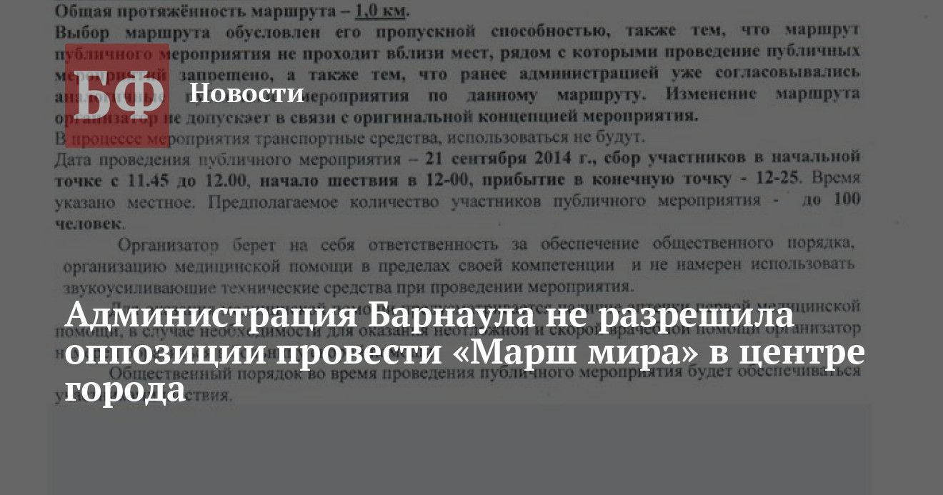 Администрация Барнаула отказалась согласовать предложенный «Барнаульским гражданским движением» (БГД) маршрут шествия, который приурочен к всероссийской акции «Марш мира». Решение побудило представителей БГД направить жалобу в городскую прокуратуру и требование об устранении нарушений в саму горадминистрацию, сообщила ИА «Банкфакс» одна из организаторов акции Ольга Фотиева.