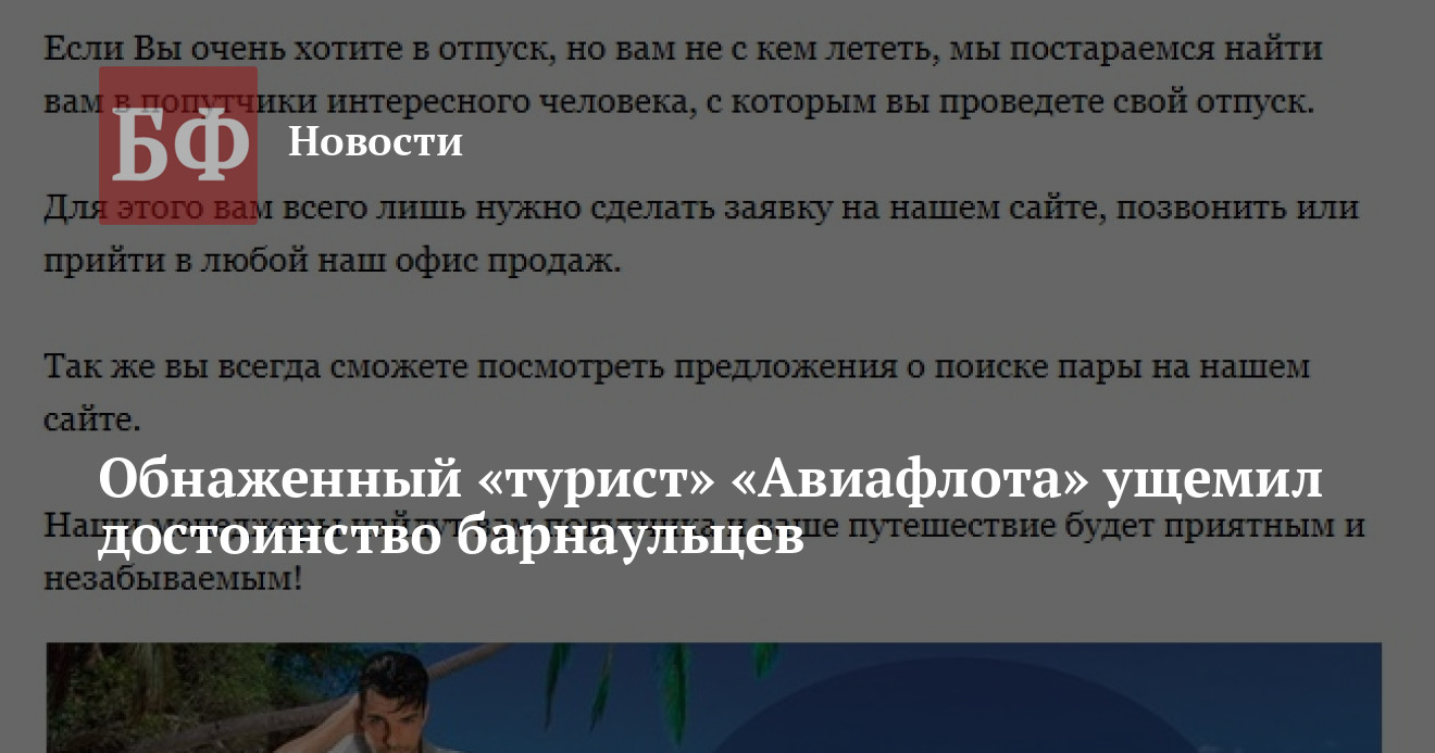 Реклама турагентства «Авиафлот» в Барнауле признана оскорбительной и непристойной, сообщает офсайт УФАС по Алтайскому краю.