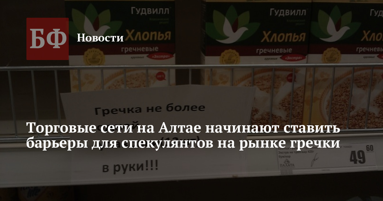Таким образом, дефицит гречневой крупы на рынке во многом вызван именно спекуляциями, и мало связан с неурожаем культуры в Алтайском крае. Несмотря на то, что ряд поставщиков прекратил отгрузку продукции, имеющейся гречки вполне хватает для удовлетворения обычного спроса. «Крупы меньше, но не критично. Раньше у нас продавалось восемь наименований, теперь — два. Это связано с отказом поставщиков от отгрузки, в том числе и из Алтайского края. Но два оставшихся оптовика выполняют свои обязательства в полном объеме и сейчас гречка в «Палате» есть», — рассказали в представительстве «Холидея».
