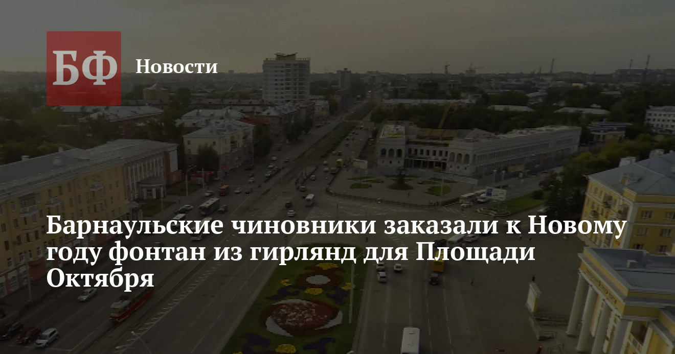 15 декабря в Барнауле состоится аукцион на право выполнения работ по «праздничному оформлению Площади Октября», которое подразумевает установку семиметрового светодинамического фонтана. Об этом свидетельствует сайт Госзакупок. Заказчиком выступает администрация Октябрьского района Барнаула.