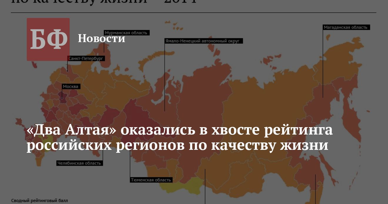 «Два Алтая» оказались во второй половине рейтинга регионов России по качеству жизни. При этом, если Алтайский край еще может считать свой показатель приемлемым, благодаря небольшому улучшению позиции, то Республика Алтай одновременно является одним из самых бедных регионов, демонстрирующим падение основных показателей. Информацию об исследовании опубликовало агентство «РИА-Рейтинг».