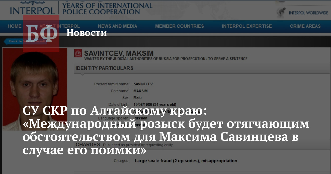 Международная организация уголовной полиции подключилась к поискам обвиняемого в нескольких эпизодах мошенничества и присвоении денежных средств по делу УК «Доверие» сына главы администрации Барнаула Максима Савинцева. Это означает, что его могут задержать при операциях с документами и попытке пересечения границы любой из 190 стран-участников, а также что ему вряд ли придется рассчитывать на смягчение приговора в случае поимки и вынесения обвинительного вердикта.