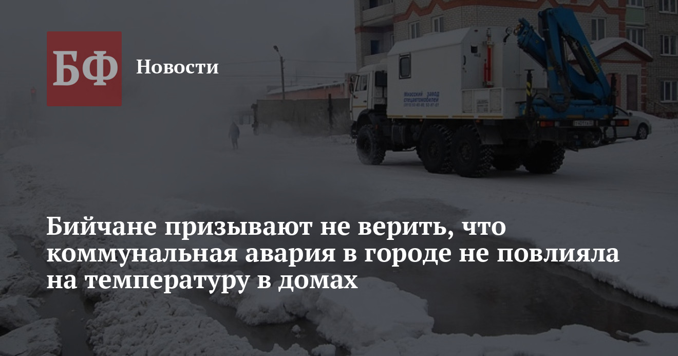 27 января жители Бийска выражают «ВКонтакте» возмущение по поводу того, что многим из них отключили отопление и горячее водоснабжение в тридцатиградусный мороз. По версии большинства форумчан, такие меры управляющих компаний были связаны с коммунальной аварией на улице Социалистической. Информация опубликована в группе «Бийск».