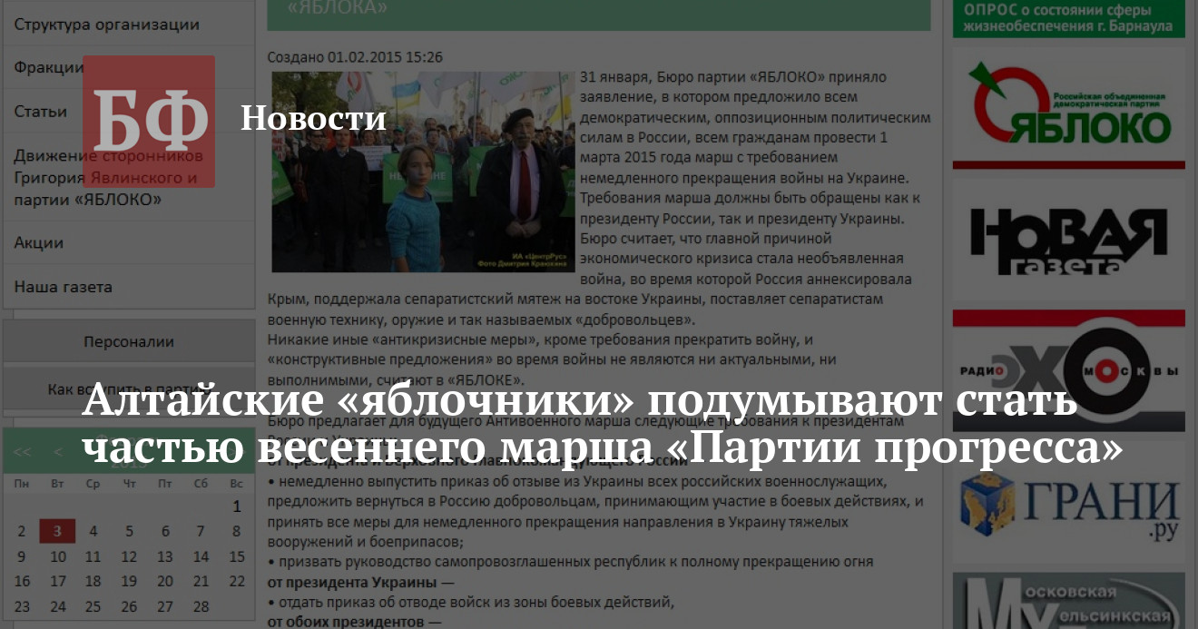 К вечеру 3 февраля никаких предложений по проведению совместной акций от «Яблока» к «Партии прогресса» по-прежнему не поступало, сообщила г-жа Фотиева. Однако организаторы «Антикризисного марша» были бы рады участию «яблочников». «Да, никакого обращения организаторам мы пока не направляли. Акция согласовывается не ранее, чем за 15 дней до дня проведения, к этому моменту мы проведем консультации с возможными партнерами и примем решение. А вдруг в этом марше будут принимать участие силы, поддержавшие агрессивные действия на Украине? Мы на такое не согласны», — сказал г-н Гончаренко. Таким образом, вопрос о составе участников «Антикризисного марша» в Барнауле остается открытым.