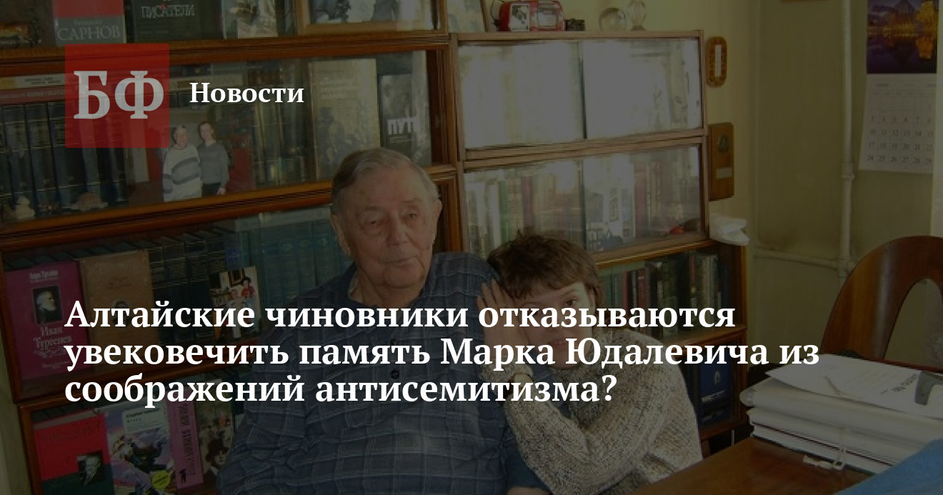 Юлия Верхуша, приходящаяся внучкой известному алтайскому писателю Марку Юдалевичу, заявила о том, что региональные власти не идут ей навстречу в вопросе увековечивания его памяти. Более того, основной причиной отказа являются еврейские корни патриарха краевой литературы. Пост соответствующего содержания был опубликован на странице внучки Юдалевича в Facebook.