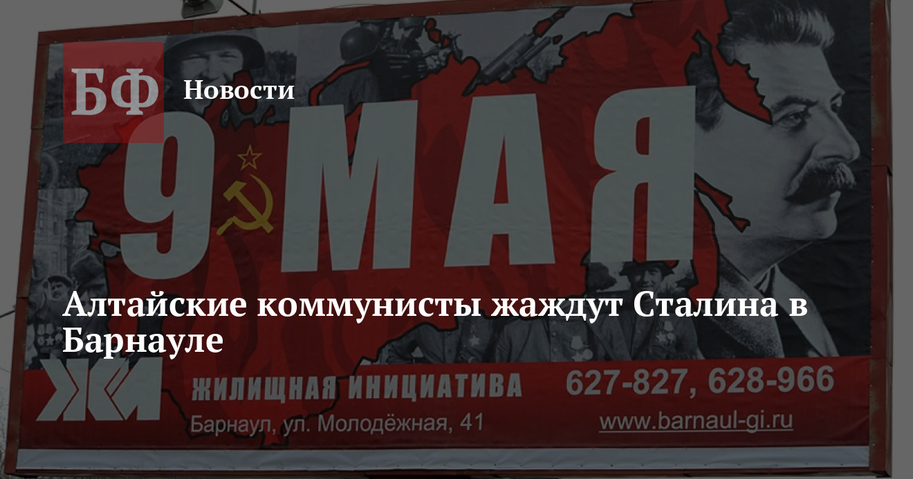 Коммунисты помимо этого рекомендуют при оформлении городских улиц к 9 мая на билбордах и в информационных материалах поместить фотографию генералиссимуса Иосифа Сталина, а также установить на бульваре Защитников Сталинграда бюст вождя. Для реализации данного решения фракция КПРФ в Гордуме направила обращение на имя главы Барнаула Людмилы Зубович. В документе содержится ряд предложений, касающихся увековечивания памяти героев Великой Отечественной войны, которые были родом с Алтая. «Помимо письменного заявления мы планируем озвучить свои предложения на ближайшей сессии городского парламента», — уточнил первый секретарь Барнаульского горкома КПРФ, руководитель фракции коммунистов в гордуме Андрей Сартаков.