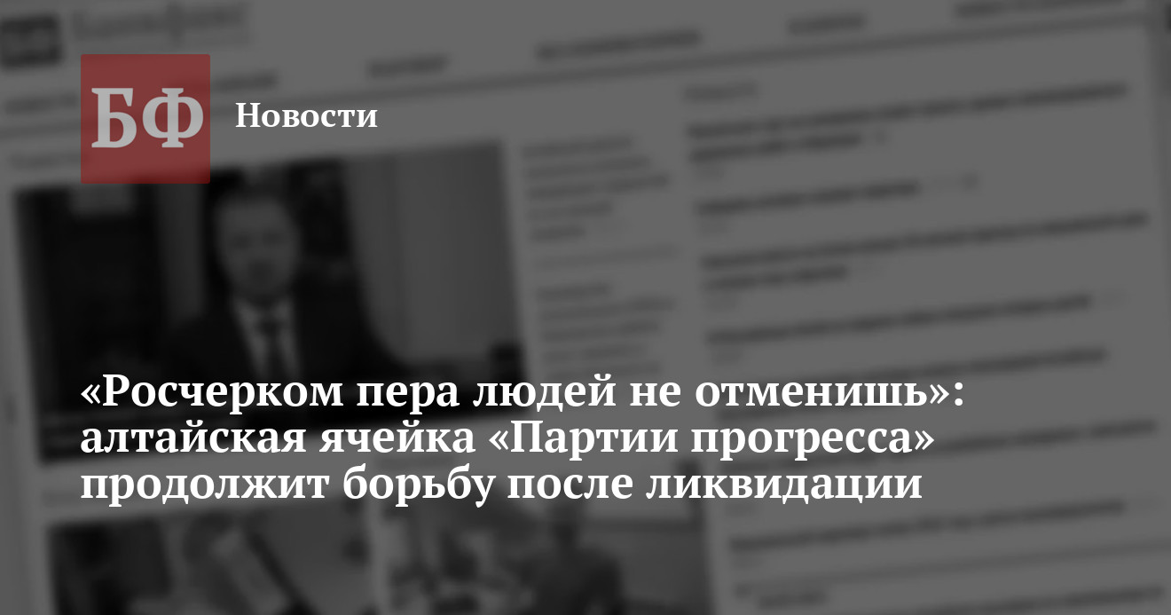 Члены алтайского реготделения «Партии прогресса», которая 28 апреля неожиданно для многих лишилась государственной регистрации, продолжат свою деятельность, несмотря на то, что фактически стали беспартийными. Они не будут вступать в союзническую «РПР-ПАРНАС», поскольку у партии Навального еще есть шансы восстановиться в прежнем виде с помощью суда или перерегистрации, рассказала ИА «Банкфакс» председатель реготделения Ольга Фотиева.