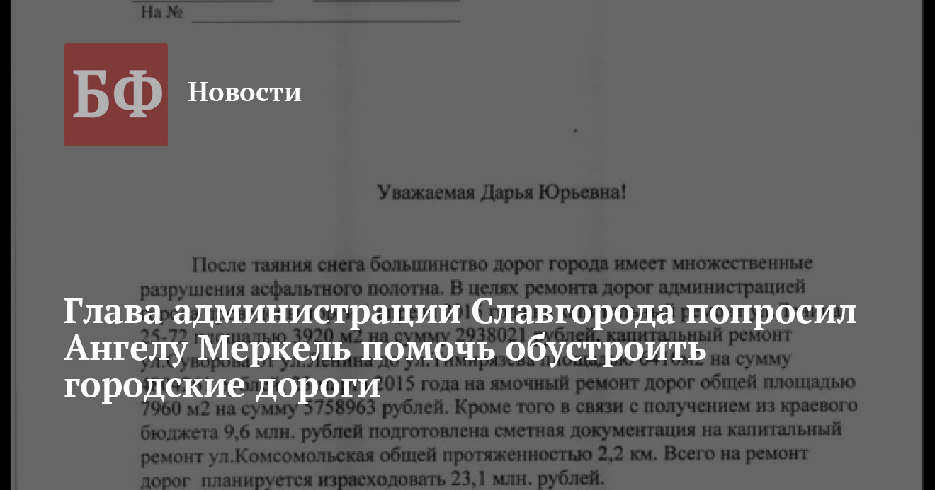Глава администрации Славгорода Виктор Кинцель посоветовал переехавшей в Германию местной жительнице обратиться к европейским лидерам, чтобы решить проблему дорог в алтайском городе. Согласно ответу чиновника на обращение экс-горожанки, канцлер Германии Ангела Меркель может повлиять на президента Франции Франсуа Олланда, чтобы тот вернул деньги за «Мистрали», и президента Украины Петра Порошенко, чтобы он соблюдал «Минские соглашения». Копию ответа публикует сообщество «Подписи на восстановление дорог в Славгороде» в «Одноклассниках».