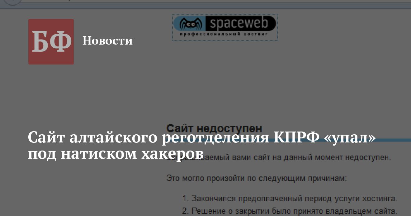 С утра 5 июня сайт регионального отделения КПРФ в Алтайском крае недоступен для пользователей Сети: при попытке зайти на главную страницу выдается стандартная «заглушка» хостинг-провайдера. Ресурс пал под натиском DDoS-атаки и не вернет работоспособность как минимум до 13:00, сообщил ИА «Банкфакс» пресс-секретарь партийной ячейки Евгений Платунов.