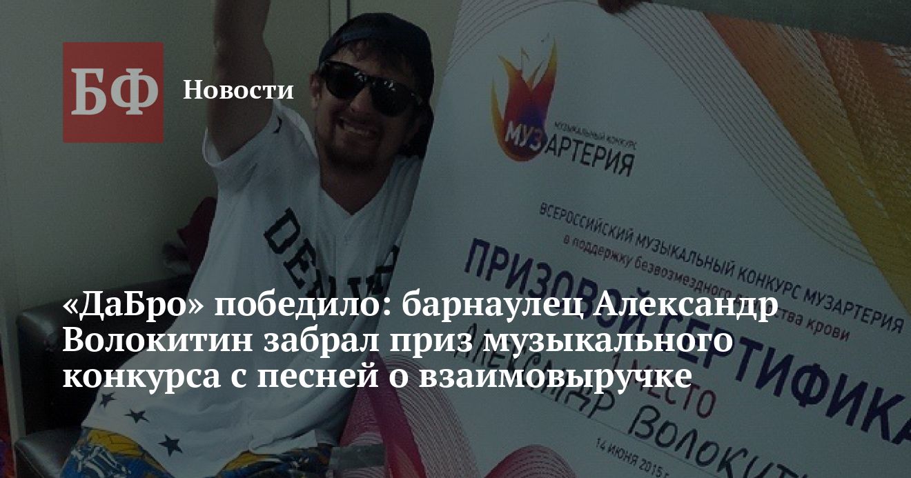 Барнаулец Александр Волокитин написал песню «ДаБро», с которой принял участие во всероссийском музыкальном конкурсе в поддержку донорского движения «Музартерия-2015». Сингл приглянулся группе «Банд'Эрос», с участниками которой алтайским певцом был записан клип, принесший музыканту победу в конкурсе. Об этом сообщает «Служба новостей FM-Продакшн».