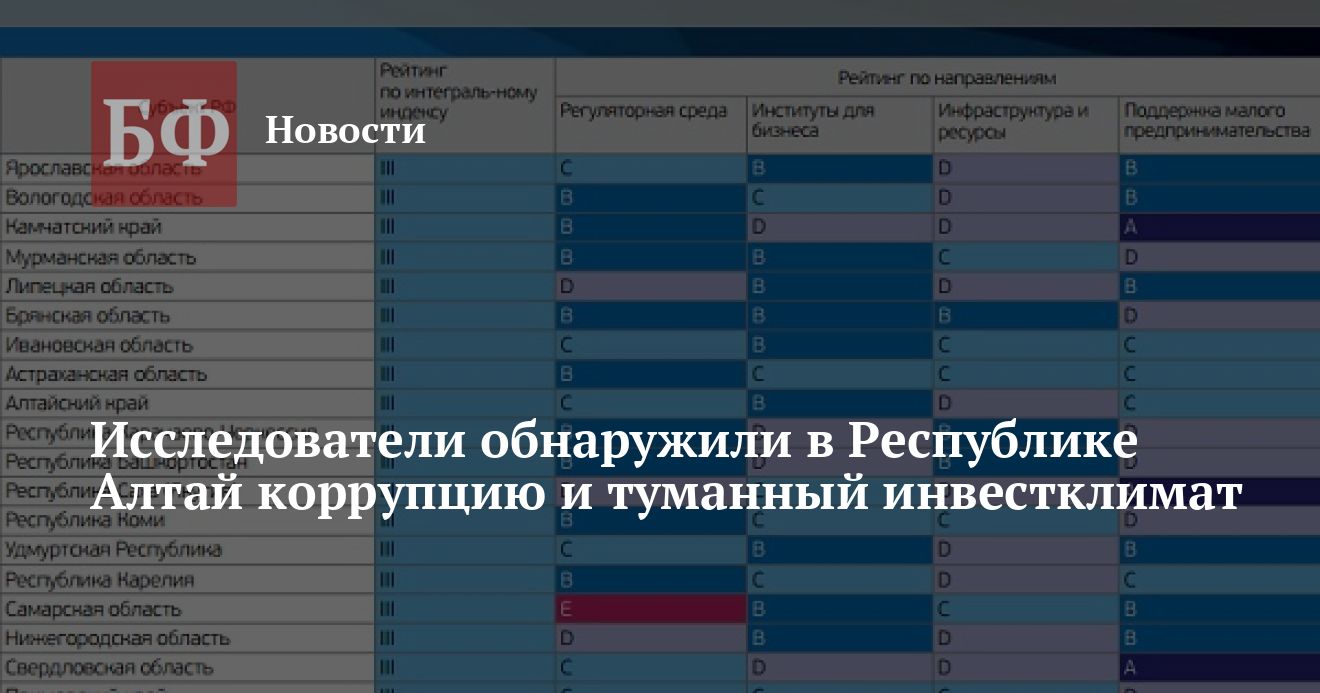 Алтайский край оказался в III группе (итоговое 38-ое место), расположившись между Астраханской областью и Карачаево-Черкессией. Лучшая оценка — у «институтов для бизнеса« («В»), «регуляторная среда« и «поддержка малого предпринимательства« синхронно получили «С», а вот «инфраструктура и ресурсы« — только «D». В пятую, худшую группу, наряду с Рязанской областью, Северной Осетией, Забайкальским краем, Амурской и Иркутской областями, Тывой угодила Республика Алтай (72-ое место). Худшую оценку из всех возможных регион заслужил по инфраструктуре и регуляторной среде — «Е», а вот институты для бизнеса и поддержка малого предпринимательств получили от экспертов АСИ маркировку «С».