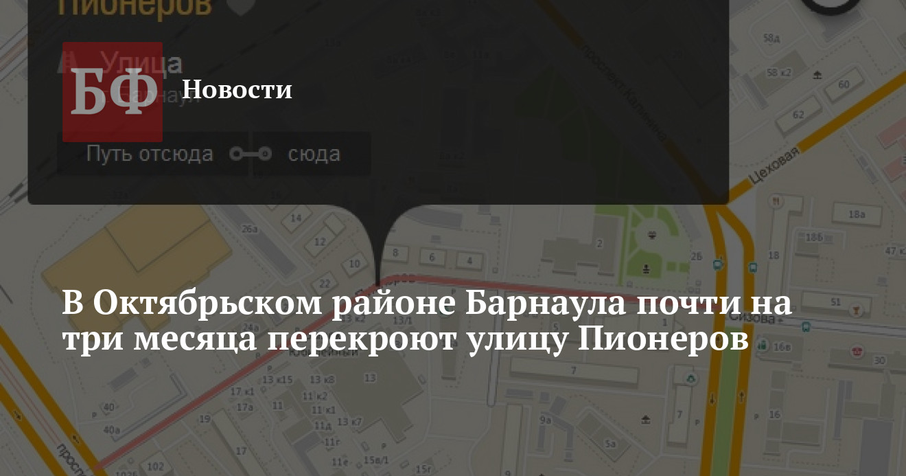 По информации комитета по дорожному хозяйству, благоустройству, транспорту и связи города, перекрытие улицы Пионеров от проспекта Ленина до проспекта Калинина будет организовано с 20:00 8 июля до 20:00 30 сентября. Это связано с проведением работ по устройству ливневой канализации, а также реконструкции дорожного полотна.