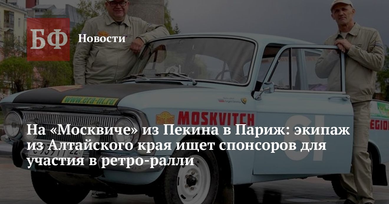 Экипаж знаменитого «Москвича-412», который в 2013 году сенсационно завоевал бронзовые медали в своем классе, снова планирует принять участие в ралли «Пекин-Париж». Однако для этого единственной за всю историю соревнований российской команде нужно найти 46 тысяч фунтов стерлингов (почти 5 млн рублей по курсу ЦБ на 24 августа) на стартовый взнос плюс оплатить доставку автомобиля в Пекин и из Парижа. Об этом ИА «Банкфакс» рассказал исполнительный директор Алтайской федерации автомобильного спорта (АФАС), призер заезда 2013 года Евгений Смирнов.