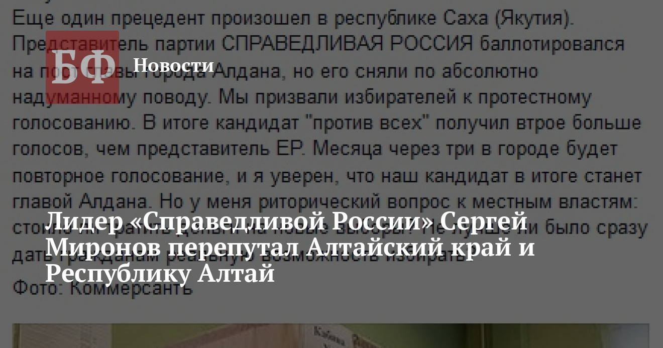 Лидер фракции «Справедливой России» в Госдуме Сергей Миронов запутался, в каком из «двух Алтаев» представитель его партии прошел в региональный парламент. В сообщении в своем Facebook он заявил, что кандидат эсеров прошел «в Курултай (Заксобрание) Алтайского края», хотя на самом деле случай имел место в Республике Алтай. Сообщение депутата вызвало нешуточный резонанс в алтайских соцсетях.