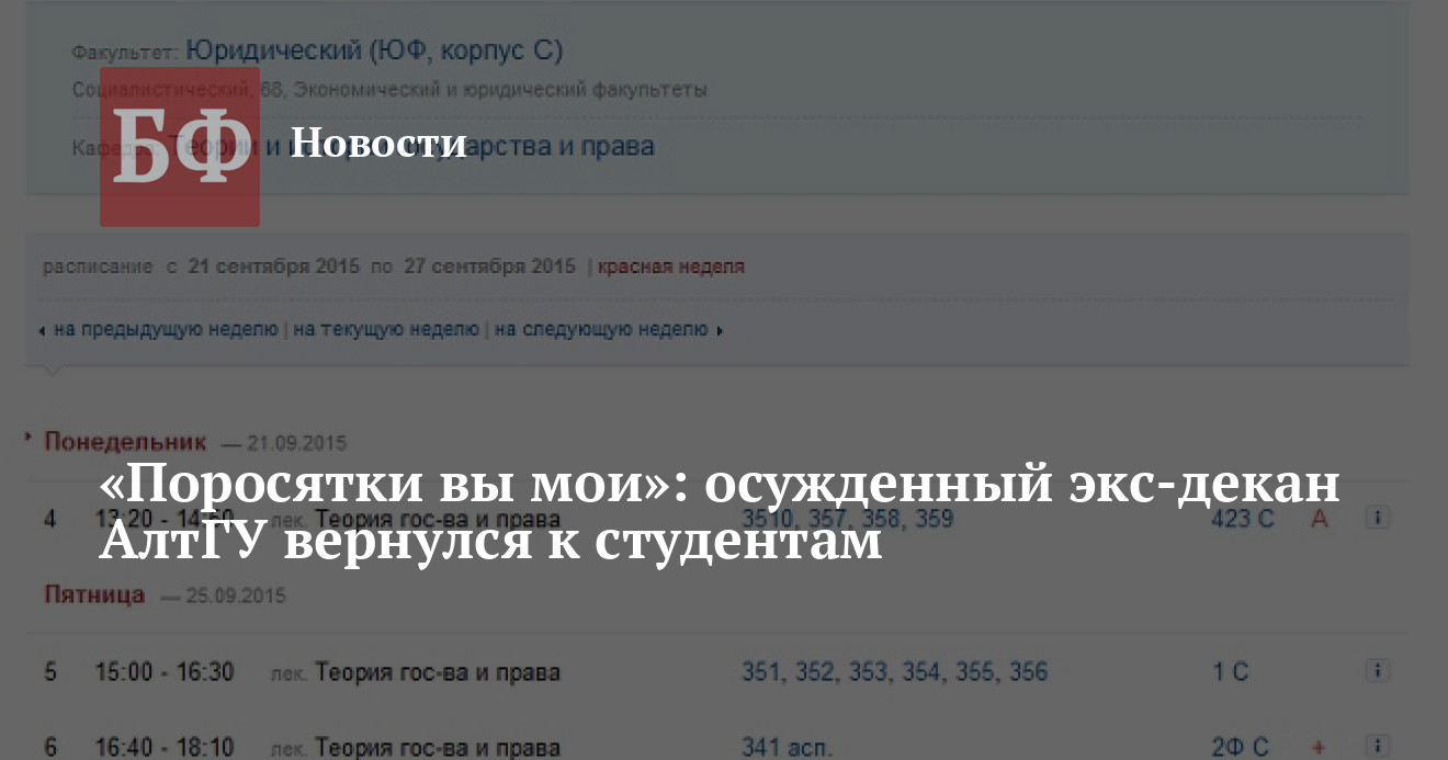 По данным собеседника, накануне нового учебного года г-н Сорокин написал заявление на имя ректора с просьбой восстановить его сразу в трех должностях — декана, завкафедрой теории государства и права (ТГП) и профессора. Однако после некоторых «торгов» ректорат с опальным преподавателем сошлись на том, что Виталий Сорокин получит все, кроме места во главе деканата. По некоторым данным, компромисс связан с позицией Ученого совета АлтГУ, который был категорически против восстановления г-на Сорокина. Такой настрой источник склонен объяснять тем, что за предыдущие годы у осужденного педагога не сложились отношения со многими деканами вуза. В то же время ректорат якобы был не против принять назад «блудного сына».