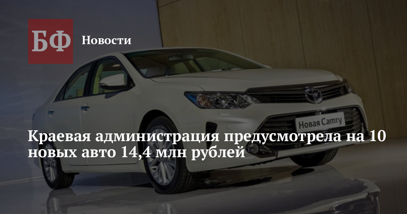 Управление делами администрации Алтайского края 11 сентября подписало контракт на поставку трех Toyota Camry с ООО «Рольф Моторс». Цена одного ТС составляет 1,484 млн рублей. Информация размещена на сайте Госзакупок.