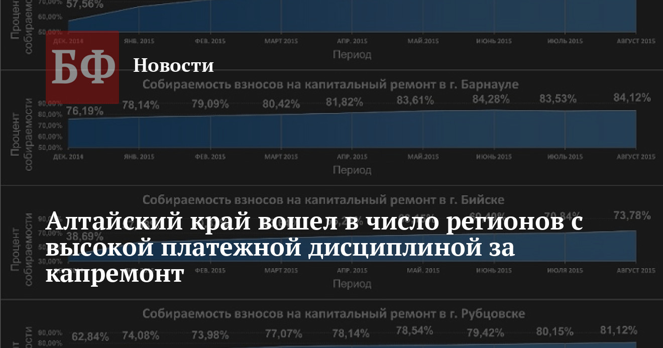 При этом минимальная собираемость до Нового года оказалась в наукограде — 38,69%, а максимальная в краевом центре — 76,19% (по субъекту — 57,56%). Далее, с наступлением 2015 года, размер взносов в процентных долях постепенно увеличивался. Пиковые значения почти повсеместно были достигнуты к концу лета. Так, в Рубцовске, по данным за август, «индекс собираемости» составил 81,12%, в Барнауле— 84,12%, а в Бийске — 73,78%. Для региона в целом показатель равен 77,2%.