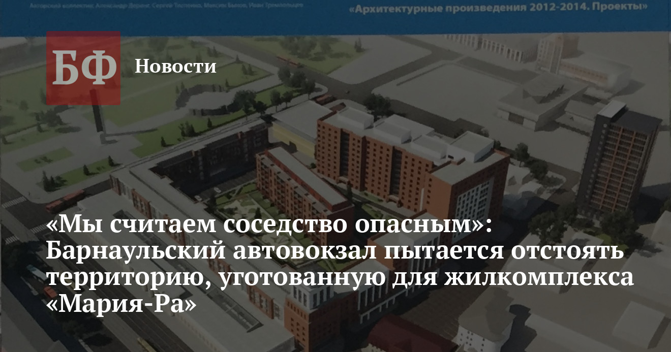 По словам г-жи Тумбаевой, с августа 2015 года ООО «Барнаульский автовокзал» испытывает давление со стороны застройщика участка — ООО «Первый» (одно из юрлиц торговой сети «Мария-Ра» — прим. ред. «БФ»). Представители ритейлера устно и письменно побуждают вокзал добровольно сократить санитарно-защитную зону вокруг объекта, что по мнению юриста повлечет иски со стороны будущих жильцов комплекса. «Наш автовокзал — объект III класса опасности, вокруг него есть санитарно-защитная зона. Ее сокращение возможно по решению главного санитарного врача Алтайского края (должность занимает руководитель Роспотребнадзора по региону Ирина Пащенко — прим. ред. „БФ“). Если это случится, мы получим огромное жилое здание в непосредственной близости от вокзала и его будущие жильцы смогут жаловаться на нас в контролирующие органы, например, из-за неизбежного загрязнения воздуха», — сказала Наталья Тумбаева.